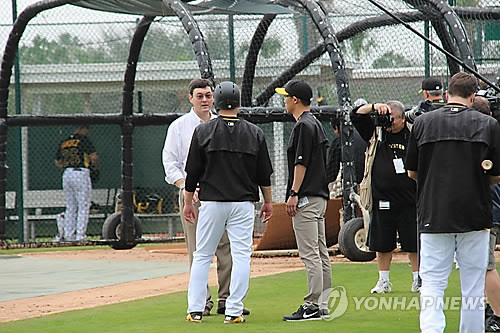 | △ (브래든턴<미국 플로리다주>=연합뉴스) 장현구 특파원 = 미국프로야구 피츠버그 파이리츠의 로버트 너팅 구단주가 25일(현지시간) 스프링캠프인 미국 플로리다 주 브래든턴의 파이리트 시티를 찾아 강정호와 인사하고 있다. 2015.2.26 cany9900@yna.co.kr |
