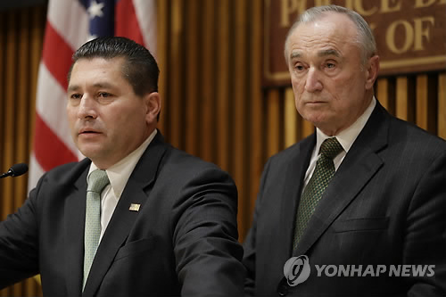 | △ 미, IS 합류시도 외국인 3명 체포 (AP=연합뉴스) 25일(현지시간) 미국 뉴욕 경찰본부에서 윌리엄 브래튼 경찰국장(오른쪽)이 연방수사국(FBI) 뉴욕지구대 책임자와 함께 기자회견을 통해 이슬람 급진주의 무장단체인 '이슬람국가'(IS)에 가입하려던 뉴욕 거주 외국인 남성 3명 체포 사실을 밝히고 있다. |