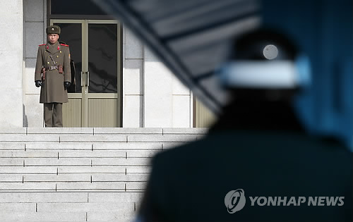 | △ 여전히 대치 중 (판문점=연합뉴스) 신준희 기자 = 4일 판문점 북측 지역인 판문각에서 북한군 병사가 남측 지역을 주시하고 있다. 오른쪽은 경계근무 중인 우리 군 병사. 2015.2.4 hama@yna.co.kr |