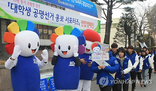 | △ '농촌의 권력' 조합장 선거 깨끗하게 (춘천=연합뉴스) 전국 동시 조합장선거 후보자 등록 마감일인 25일 대학생 공명선거 홍보 응원단이 농협 강원지역본부 앞에서 공명 선거 캠페인을 하고 있다. 2015.2.25 <<농협 강원본부>> dmz@yna.co.kr |