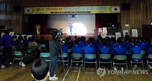| △ 춤과 노래, 웃음으로 맞이한 서울소년원의 봄 (의왕=연합뉴스) 26일 오후 경기도 의왕시 고천동 서울소년원(고봉중고등학교)에서 '봄맞이 페스티벌'이 열리고 있다. 학교 측은 재소자 교화의 대부인 박삼중 스님과 일본의 유명 연예기획사 대표인 타이라 테츠오씨의 방문을 맞아 이번 행사를 마련했다. 타이라 대표는 이날 학생들이 입고 있던 체육복을 구입해 최근 소년원 측에 전달했고 직접 이곳을 찾아 모범학생·무의탁학생 등 20명에게 지원금을 전달하는 한편 페스티벌에 참석해 특강을 하고 만찬을 제공했다. 2015.2.26 <<서울소년원 제공>> zorba@yna.co.kr |