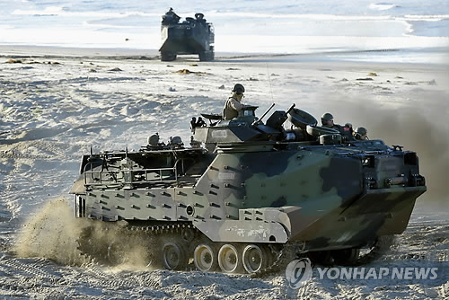 (도쿄=연합뉴스) 조준형 특파원 = 미국 해병대와 일본 육상자위대는 25일(현지시간) 미국 캘리포니아주에서 미군 수륙 양용차 'AAV7'을 활용한 대규모 낙도 탈환 훈련을 실시했다고 교도통신이 26일 보도했다.
