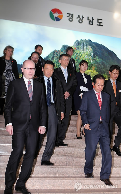 | △ 경남도 찾은 체코 총리 (창원=연합뉴스) 최병길 기자 = 홍준표 경남도지사와 보후슬라프 소보트카 체코 총리가 26일 오후 경남도에서 가진 교역·투자 증진 등 경제협력 확대 방안 협의를 마치고나서 나란히 도청 계단을 내려가고 있다. |