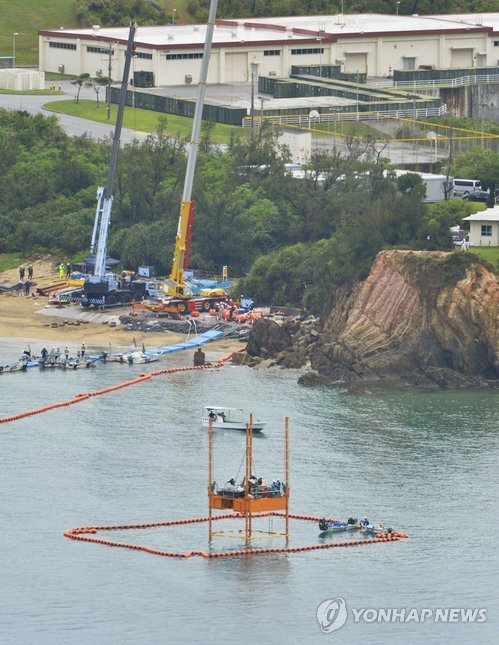 | △ (오키나와 교도=연합뉴스.자료사진) 일본 정부가 오키나와(沖繩)현 주일미군 후텐마(普天間) 비행장(기지)의 이전 대상지인 현내 헤노코(邊野古) 연안에서 지질조사가 진행되는 모습. |
