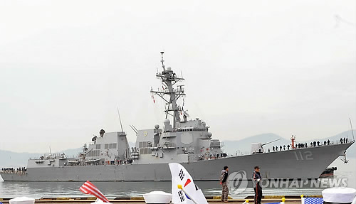 | △ 미국 이지스 구축함 (영암=연합뉴스) 25일 오후 독수리(FE) 훈련 참가를 위해 전남 목포 신항만부두에 입항한 미국 해군 알레이버크급 이지스 구축함 마이클 머피(Michael Murphy)함. 2015.2.25 <<3함대>> chogy@yna.co.kr |