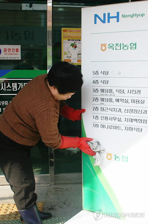 | △ 옥천농협 업무재개 준비 (옥천=연합뉴스) 박병기 기자 = 충북 옥천농협 노조가 파업 19일만인 30일 업무복귀를 선언한 가운데 청소용역업체의 한 직원이 창구 입구의 안내판에 쌓인 먼지를 닦아내면서 영업준비를 하고 있다. 2015.1.30 bgipark@yna.co.kr |