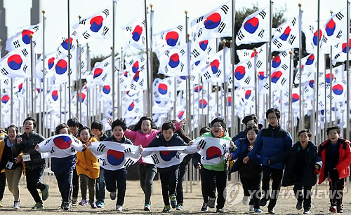 | △ 힘내라 대한민국~ (천안=연합뉴스) 양영석 기자 = 제96주년 3·1절을 사흘 앞둔 26일 충남 천안 독립기념관을 찾은 어린이들이 태극기가 펄럭이는 광장을 힘차게 뛰어가고 있다. 2015.2.26 youngs@yna.co.kr |