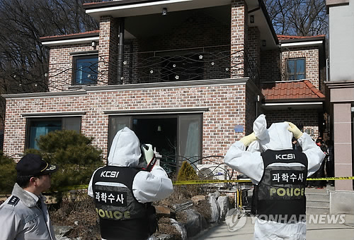 | △ 경기 화성 공기총 난사 사건 현장 (화성=연합뉴스) 신영근 기자 = 27일 오전 공기총 난사로 4명이 숨진 경기도 화성 사건 현장에서 경찰 관계자들이 조사를 벌이고 있다. |