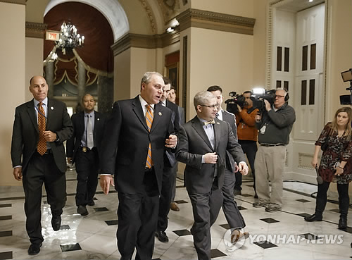 | △ 미국 하원이 국토안보부의 부분업무정지(셧다운) 시점을 1주일 뒤로 미뤘다. 국토안보부의 잠정예산안 시한을 오는 3월 6일까지 연장하는 내용의 수정안을 가결하고 나오는 미 하원 의원들. (AP=연합뉴스) |