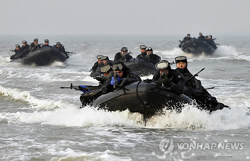 | △ 한미 연합 해상침투훈련 (서울=연합뉴스) 10일 강화도 하일리 해안에서 열린 한미 해병대 연합 해상침투훈련에서 장병들이 상륙 기습 고무보트(IBS)를 이용해 상륙해안으로 기동하고 있다. 2015.2.10 << 해병대사령부 제공 >> photo@yna.co.kr |