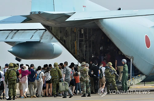 | △ 일본 자위대가 2015년 2월 15일(현지시간) 태국 중부 우타파오 해군 항공기지에서 국외 일본인 대피 훈련을 실시하는 장면(교도=연합뉴스DB) |