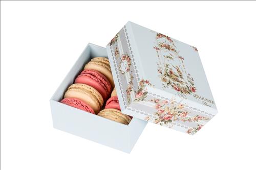 연인의 모습이 담긴 상자에 라뒤레의 인기 제품인 라즈베리 마카롱과 바닐라 마카롱이 각각 4개씩 총 8개 들어 있다.