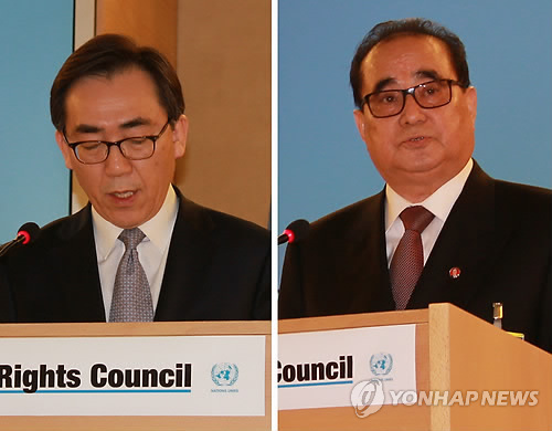 | △ 남북, 유엔 인권이사회서 北 인권 놓고 격돌 (제네바=연합뉴스) 류현성 특파원 = 남북이 3일(현지시간) 스위스 제네바 유럽 유엔본부에서 열린 유엔 인권이사회에서 북한 인권문제를 둘러싸고 격돌했다. 북한 리수용 외무상(오른쪽)은 허위 증언에 기초한 반공화국 결의를 무효화해야 한다고 주장했고, 우리 정부 조태열 외교부 2차관(왼쪽)은 `손바닥으로 하늘을 가릴 수 없는 법'이라며 북한 당국의 반인도주의적 인권유린 행위 즉각 중단을 촉구했다. 2015.3.4 rhew@yna.co.kr |