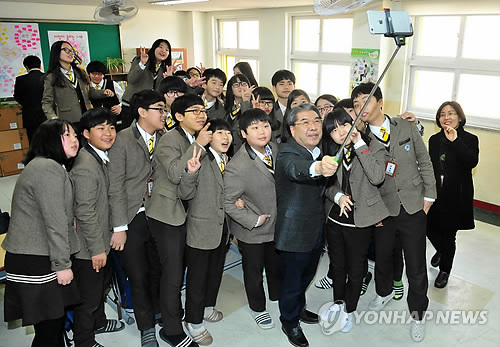 | △ 학생들과 '셀카봉'으로 기념사진 찍는 이재정 교육감 (수원=연합뉴스) 경기도 수원시 서호중학교 2학년 4반 1일 명예교사로 나선 이재정 경기도교육감이 수업을 마친뒤 학생들과 '셀카봉'을 이용해 기념사진을 찍고 있다. 2015.3.4 <<경기교육청 제공>> young86@yna.co.kr |