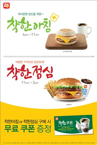 착한아침은 오전 4~11시 운영하는 제품으로 머핀류 4종과 라이스류 2종 등으로 이뤄졌다. 오전 11시부터 3시간 동안 운영하는 착한점심은 롯데리아가 업계 최초 3천원 이하(데리버거 2천900원) 제품을 내 놓으면서 지속적으로 인기를 끌고 있다.