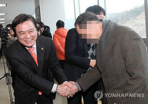 | △ '감사합니다' (청주=연합뉴스) 김형우 기자 = 9일 청주지법 형사합의 11부(이관용 부장판사)로부터 기부행위 등 혐의(지방교육 자치에 관한 법률 위반)에 대해 무죄를 선고받은 김병우(왼쪽) 충북도교육감이 재판장을 나서며 자신의 지지자들과 악수를 하고 있다. 2015.2.9 vodcast@yna.co.kr |