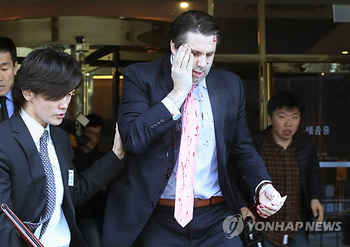 | △ 민화협 행사장서 괴한 공격당한 리퍼트 주한 미 대사 (서울=연합뉴스) 김주성 기자 = 마크 리퍼트 주한 미대사가 5일 오전 서울 세종문화회관에서 열린 민화협 주최 초청 강연에 참석했다가 괴한의 공격을 받고 피를 흘리며 행사장을 빠져나가고 있다. 2015.3.5 utzza@yna.co.kr |