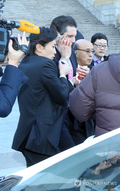 | △ 민화협 행사서 괴한 공격당한 리퍼트 주한 미 대사 (서울=연합뉴스) 김주성 기자 = 마크 리퍼트 주한 미대사가 5일 오전 서울 세종문화회관에서 열린 민화협 주최 초청 강연에 참석했다가 괴한의 공격을 받고 피를 흘리며 병원으로 향하고 있다. 2015.3.5 utzza@yna.co.kr |