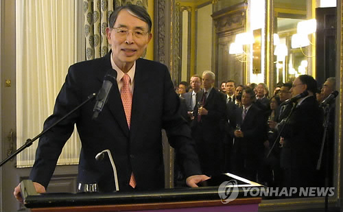 | △ 송상현 ICC 소장 퇴임 환송 리셉션 연설 (헤이그=연합뉴스) 송병승 특파원 = 송상현 국제형사재판소(ICC) 소장이 4일(현지시간) 네덜란드 헤이그에서 열린 퇴임 환송 리셉션에서 연설하고 있다. |