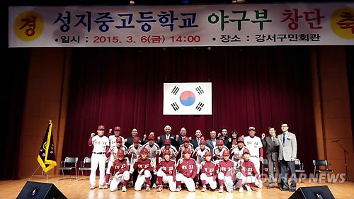 | △ 대안학교 성지고 야구단 창단 (서울=연합뉴스) 이대희 기자 = 대안학교 성지고는 6일 오후 서울 강서구 강서구민회관에서 야구단 창단식을 열고 첫 걸음을 내디뎠다. |