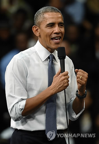 | △ '사회 참여' 강조하는 오바마 (AP=연합뉴스) 버락 오바마 미국 대통령이 6일(현지시간) 사우스캐롤라이나주 컬럼비아에서 열린 타운홀 미팅에 참석해 사회 참여의 중요성을 역설하고 있다. |