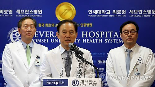 | △ 리퍼트 대사 회복상태 브리핑 (서울=연합뉴스) 신준희 기자 = 9일 오전 마크 리퍼트 주한미국대사가 입원해 있는 서울 신촌 세브란스병원에서 정남식 연세대학교 의료원장이 회복 상태에 대해 브리핑하고 있다. |