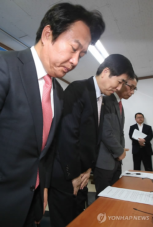 | △ 민족화해협력범국민협의회 관계자들이 지난 5일 서울 종로구 본부사무실에서 마크 리퍼트 주한 미국대사의 습격 사건에 대해 대국민사과를 하고 있다. 왼쪽부터 이성헌 상임집행위원장, 장윤석 공동 상임의장 겸 새누리당 의원, 김영만 홍보위원장. <<연합뉴스DB>> |