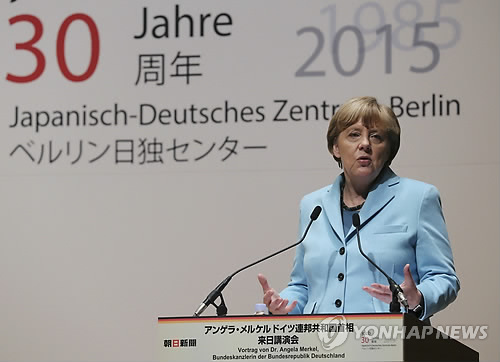 | △ 이틀간의 일정으로 일본 방문차 9일(현지시간) 도쿄에 도착한 앙겔라 메르켈 독일 총리가 아사히신문 본사에서 강연하고 있다. (AP=연합뉴스) |