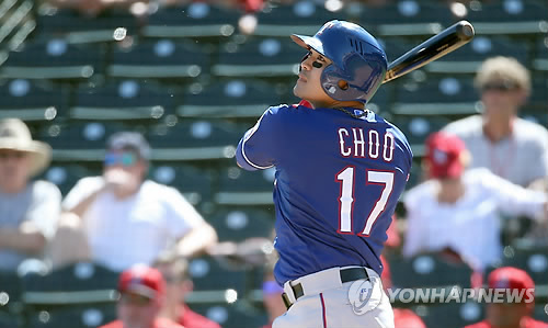 (템피<미국 애리조나주>=연합뉴스) 신창용 기자 = 추신수(33·텍사스 레인저스)는 11일(이하 한국시간) 로스앤젤레스 에인절스와의 시범경기에서 공교롭게도 왼손 투수만을 상대했다.