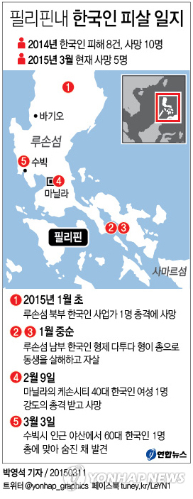 올해 들어 필리핀에서 살해된 한국인은 이 남성을 포함해 모두 4명으로 늘어났다. 작년에는 10명의 한국인이 살해됐다.