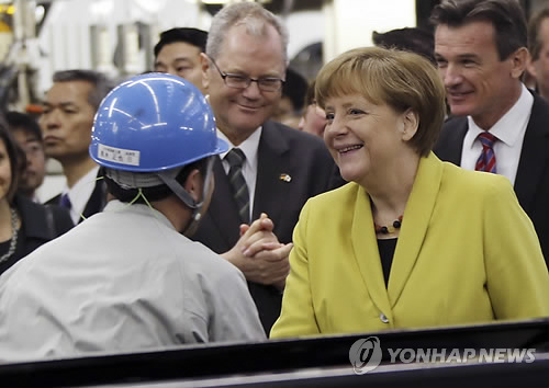 | △ "고통받은 쪽, 쉽게 잊지 못하죠" (AP=연합뉴스) 일본을 방문중인 앙겔라 메르켈 독일 총리가 10일 도쿄 인근 가와사키 소재 독일 다임러트럭 계열의 미쓰비시-푸조 트럭·버스 공장과 연구개발센터를 방문, 근로자들을 격려하고 있다. 메르켈 총리는 이날 오카다 가쓰야(岡田克也) 민주당 대표와 면담하면서 "일본과 한국은 가치관을 공유하고 있어 화해가 중요하다"고 전제하고 "고통을 준 쪽은 빨리 잊고 싶지만, 고통을 받은 쪽은 쉽게 잊을 수가 없다"며 "그런 것들을 바탕으로 화해의 문제에 대응하지 않으면 안 된다"고 말했다. |