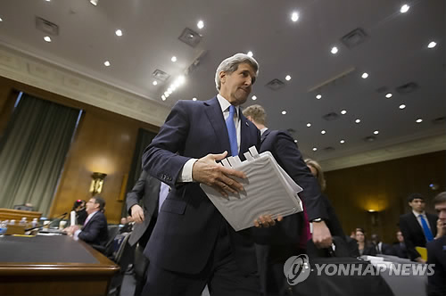 | △ (EPA=연합뉴스) 존 케리 미국 국무장관이 11일(현지시간) 열린 상원 외교위원회 청문회에 출석한 뒤 청문회장을 떠나고 있다. |