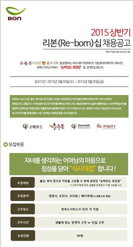 (서울=연합뉴스) 최이락 기자 = 위탁급식업체인 본푸드서비스는 능력있는 경력단절 여성을 위해 '리본(Re-born)십' 공개채용을 한다고 12일 밝혔다.