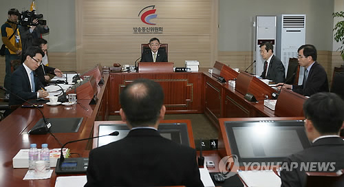 | △ '중고폰 선보상제' 회의 주재하는 최성준 위원장 (서울=연합뉴스) 최성준 방송통신위원장이 12일 오전 경기도 정부과천청사 방송통신위원회에서 이동통신3사의 '중고폰 선보상제' 위반행위에 대한 시정조치 관련 전체회의를 주재하고 있다. (방송통신위원회 제공) |