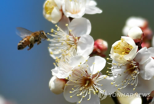 | △ 매화 오가는 꿀벌 (하동=연합뉴스) 성연재 기자 = 하얀 매화꽃에 꿀벌들이 왕성한 날갯짓을 하는 모습이 고속 촬영에 정지돼 있다. 삼성 NX-1, F2.8, 1/2000초. 2015.3.13 polpori@yna.co.kr |
