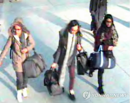 | △ 수니파 원리주의 무장세력 '이슬람국가'(IS)에 합류하기 위해 시리아로 떠난 것으로 알려진 영국 10대 여학생 아미라 아바세(왼쪽)와 카디자 술타나(가운데), 샤미마 베이검이 지난달 17일(현지시간) 터키행 비행기를 타기 위해 런던 개트윅 공항을 빠져나가고 있는 모습. (AP=연합뉴스 자료사진) |