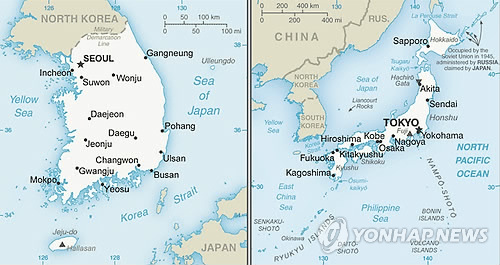 | △ 독도 '리앙쿠르암' 미 국무부 한국편 여행지도에서 실종 (워싱턴=연합뉴스) 심인성 특파원 = 미국 국무부가 독도의 미국식 표기인 '리앙쿠르암'(Liancourt Rocks)을 일본편 여행지도에는 포함시키고 한국편 여행지도에는 표시하지 않아 논란이 일고 있다. 15일(현지시각) 미 국무부 홈페이지 확인 결과 '한국 여행정보' 코너에 첨부된 지도에는 동해가 일본해로 표기된 것은 물론 리앙쿠르암 표기는 아예 등장하지 않는다. 반면 '일본 여행정보' 코너 지도에는 일본해 표기와 함께 리앙쿠르암 표기가 선명하게 표기돼 있다. 사진 왼쪽은 국무부 한국편 지도, 오른쪽은 일본편 지도. 2015.3.16 sims@yna.co.kr |