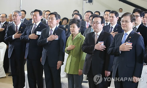 | △ 부산창조경제혁신센터 출범식 (부산=연합뉴스) 도광환 기자 = 박근혜 대통령이 16일 오전 부산 벡스코에서 열린 부산창조경제혁신센터 출범식에 참석, 국기에 대한 경례를 하고 있다. 완쪽부터 임종룡 금융위원장, 신동빈 롯데그룹 회장, 조홍근 센터징, 박 대통령, 서병수 부산시장, 최양희 미래창조과학부 장관. 2015.3.16 dohh@yna.co.kr |