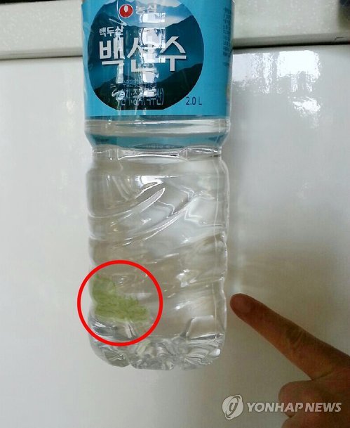 | △ 생수에서 발견된 이물질 (대구=연합뉴스) 한 소비자가 마트에서 구입한 '농심 백산수'에 이물질이 들어있다는 의혹을 제기해 당국이 조사에 나섰다. 2015.3.16 <<제보자 제공>> psykims@yna.co.kr |