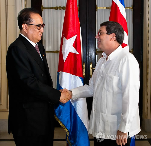 | △ 리수용 北외무상, 쿠바 방문 (AP=연합뉴스) 리수용 북한 외무상(왼쪽)이 16일(현지시간) 쿠바 아바나에서 브루노 로드리게스 쿠바 외무장관과 회담에 들어가기 전 악수를 나누고 있다. |