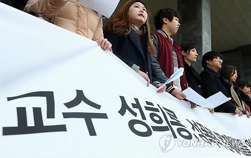 | △ 교수 성희롱, 성폭력 문제해결 공동대응 출범 기자회견 (서울=연합뉴스) 이지은 기자 = 서울대학교 학부와 대학원 학생들이 11일 오전 서울 관악캠퍼스 행정관 앞에서 교수들의 잇따른 여학생 성추행 문제에 대응하기 위해 '서울대 교수 성희롱, 성폭력 문제해결을 위한 공동행동'을 출범하며 기자회견을 열고 있다. 2015.2.11 jieunlee@yna.co.kr |