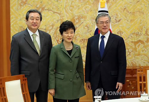 (서울=연합뉴스) 신지홍 정윤섭 기자 = 박근혜 대통령은 17일 청와대에서 새누리당 김무성 대표, 새정치민주연합 문재인 대표와 회담을 하고 경제 재도약을 위한 초당적 협력을 요청했다.
