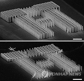 | △ 한양대 연구팀 3차원 나노구조체 합성 성공 (서울=연합뉴스) = 국내 연구진이 저온 액상공정으로 반도체 나노막대의 지름과 길이를 원하는 대로 조절해 3차원 나노구조체를 합성하는 데 성공했다. 위 사진은 액상 공정을 이용해 직경이 큰 나노막대의 길이가 직경이 작은 나노막대 보다 길이보다 긴 조건에서 3차원 나노구조체를 구현한 전자현미경 사진. 아래는 위와 같은 패턴이지만 직경이 작은 나노막대가 길이가 큰 나노막대보다 더 길게 성장 시킨 3차원 나노구조의 전자현미경 사진. (한양대 제공) |