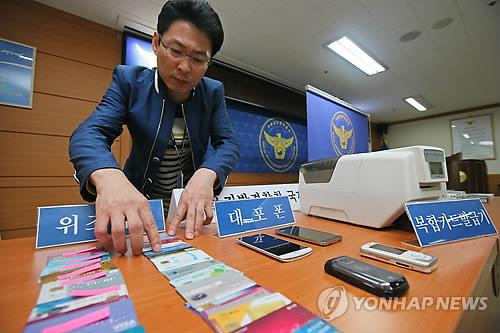 | △ 10대 신용카드 위조단 검거 (서울=연합뉴스) 박지호 기자 = 인터넷에서 불법 구매한 개인 정보를 이용해 신용카드를 복제·사용하고 위조 방법을 성인에게 전수한 10대들이 경찰에 붙잡혔다.18일 오전 사건 담당 수사관이 서울 남대문경찰서에서 카드복제기 등 증거물을 공개하고 있다. |