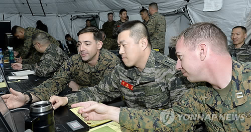 | △ 연합해병구성군 사령부 지휘소 연습 실시 (서울=연합뉴스) 한미 해병대 전투참모단 장병들이 부여된 상황에 대하여 토의를 하며 전술 조치를 하고 있다. ( 해병대사령부 제공) |