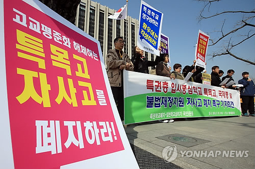 | △ 특권학교 폐지 촉구 (서울=연합뉴스) 홍해인 기자 = 특권학교폐지-일반학교살리기 국민운동 회원들이 19일 오전 서울 세종대로 정부서울청사 앞에서 특목고, 국제중, 불법재정지원 자립형사립고의 폐지를 촉구하는 기자회견을 하고 있다. 2015.3.19 hihong@yna.co.kr |