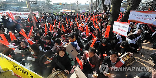 | △ 부동산중개수수료 고정요율화 촉구 집회 (수원=연합뉴스) 경기도의회가 논란을 빚은 부동산중개수수료 조례 개정과 관련 국토교통부의 권고안인 '반값 중개수수료'를 수용하기로 한 19일 오전 경기도 수원 경기도의회 앞에서 공인중개사협회 회원들이 부동산중개수수료 고정요율화를 촉구하는 집회를 개최하고 있다. 2015.3.19 << 기호일보 제공 >> drops@yna.co.kr http://blog.yonhapnews.co.kr/geenang |