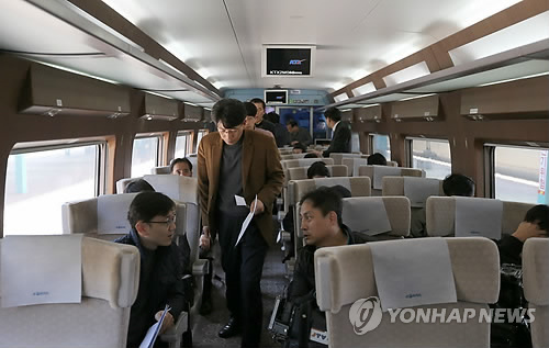 | △ KTX 살펴보는 취재진 (익산=연합뉴스) 김동철 기자 = 19일 오후 전북 익산역에서 충북 오송까지 오가는 호남고속철도 시승행사가 열린 가운데 취재진이 KTX 산천에 탑승해 내부를 살펴보고 있다. 2015.3.19 sollenso@yna.co.kr |
