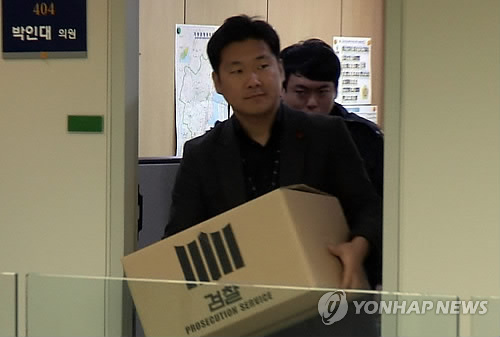 | △ 검찰, 박인대 부산시의원 사무실 압수수색 (부산=연합뉴스) 오수희 기자 = 부산지검 수사관들이 19일 오전 박인대 부산시의원 사무실을 압수수색해 자료를 들고 나오고 있다. 박 시의원은 동부산관광단지 푸드타운 시행사 대표에게서 금품을 받은 혐의로 체포됐다. |
