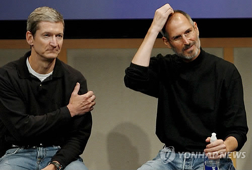 | △ 2007년 8월 미국 캘리포니아주 애플 본사에서 촬영된 스티브 잡스(오른쪽)와 팀 쿡 (EPA=연합뉴스 자료사진) |